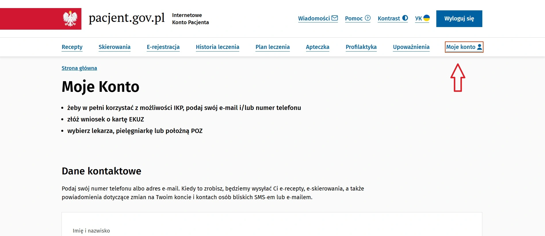 W pierwszej kolejności należy zalogować się do IKP -> Link do logowania. Sposób potwierdzenia swojej tożsamości przy logowaniu jest dowolny. Następnie należy w górnym panelu wybrać zakładkę Moje konto.