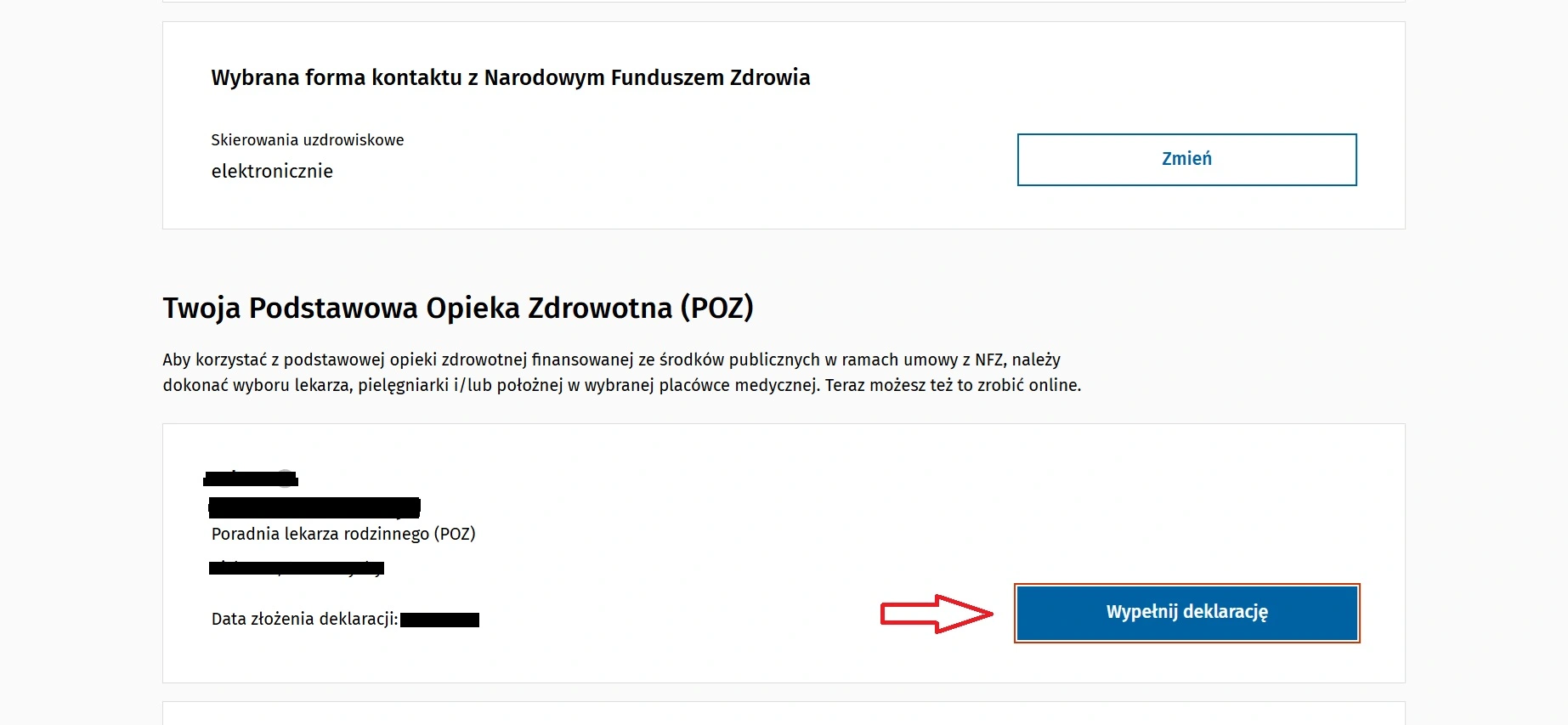 Po załadowaniu strony Moje konto, należy znaleźć na niej sekcję z nagłówkiem Twoja Podstawowa Opieka Zdrowotna (POZ). W tej sekcji znajduje należy nacisnąć przycisk Wypełnij deklarację, który znajduje się zaraz przy danych Lekarza, u którego została złożona poprzednia deklaracja.