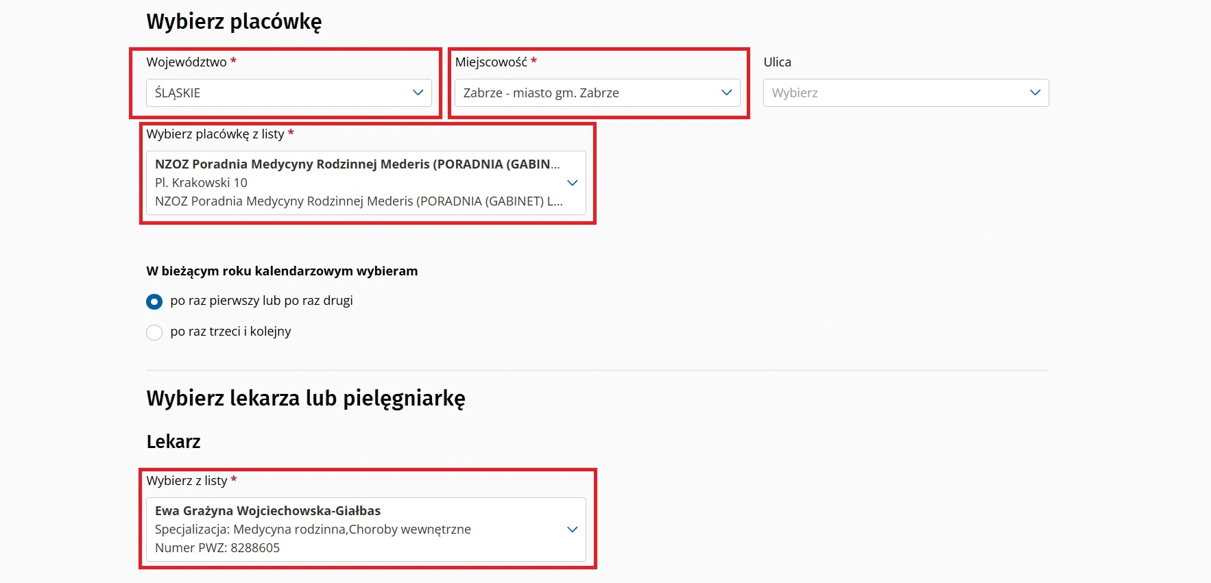 Po wybraniu placówki należy przejść poniżej do sekcji Wybierz lekarza lub pielęgniarkę i z listy wybrać jednego z lekarzy zatrudnionych w placówce.